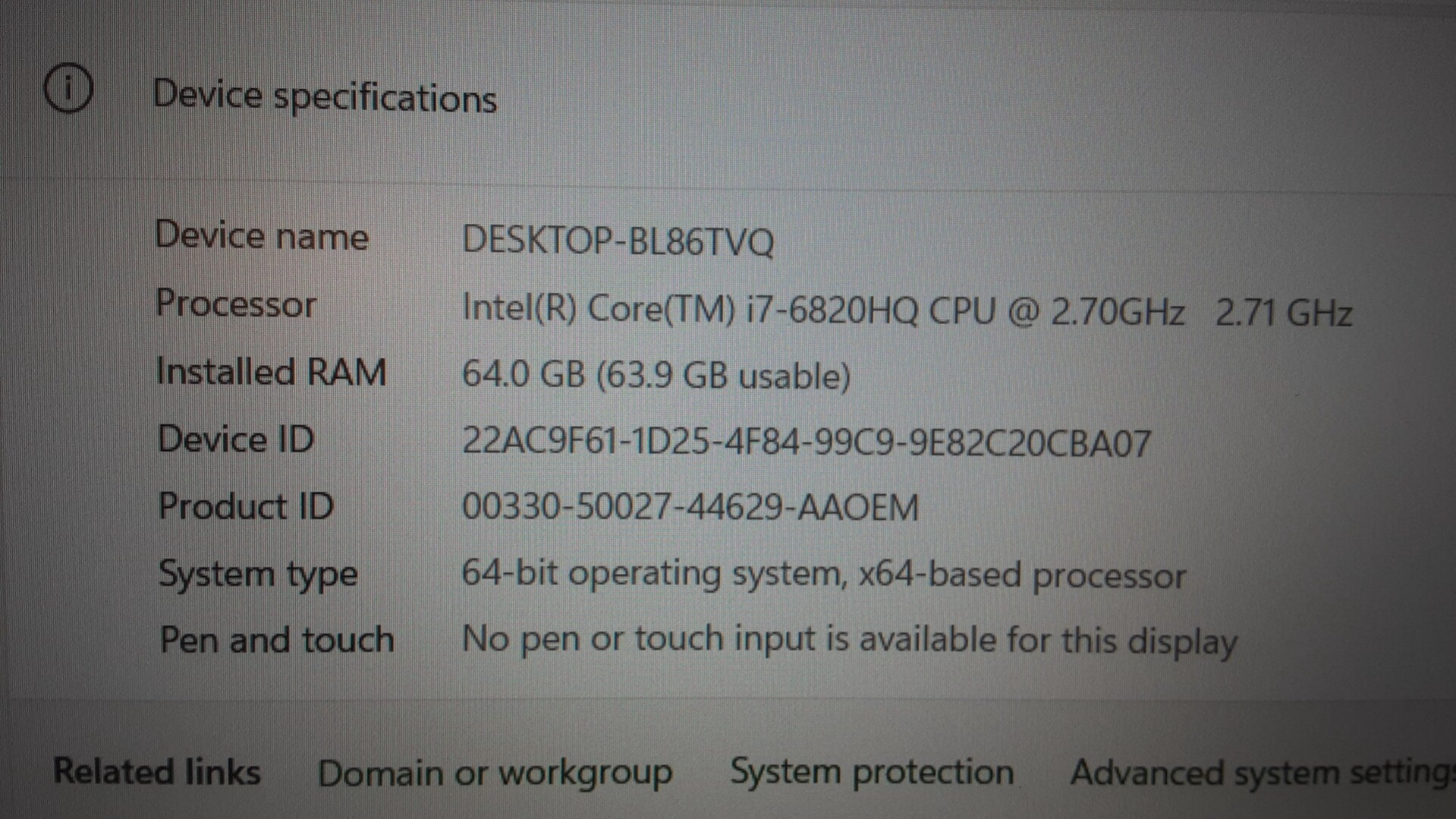 INTEL i7 CPU 6820 HQ @ 2.7 GHz, 64 GB RAM, 17" DISPLAY